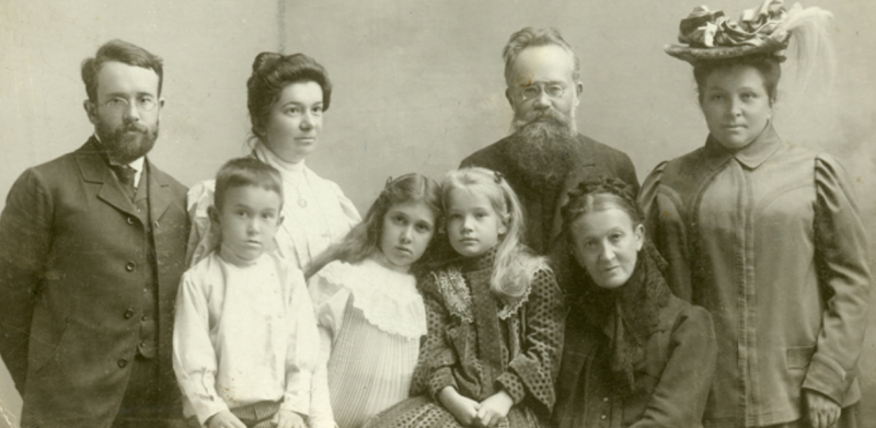 Михайло Грушевський в родинному колі. Стоять: Олександр (брат), Ганна (сестра), Михайло, Марія (дружина). Сидять: Сергій та Ольга (племінники), Катерина (донька), Глафіра Захарівна (мати). Київ, [грудень 1906 р.]. Фотограф W.Wysocki. 10,5×18 см. На паспарту 11,0×20,5 см. МІК КВ-70558 Фо-8165. У такому складі родина Грушевських влітку 1908 р. придбала садибу по вул. Паньківській, 9 у Києві.
