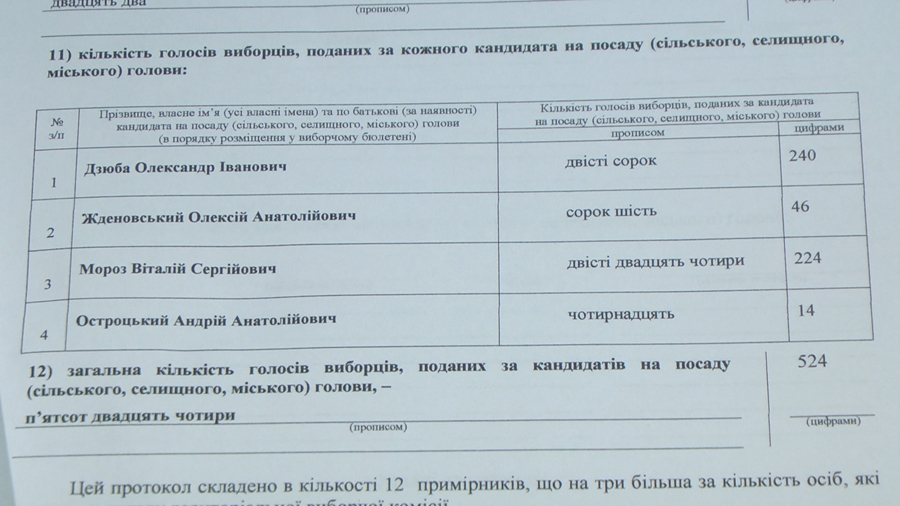 Утром, не смотря на отчаянное противодействие, избирательная комиссия зачитала протокол с результатами голосования по выборам Святогорского городского головы. Согласно данным, городским головой Святогорска стал Александр Иванович Дзюба, занимавший эту должность ранее.