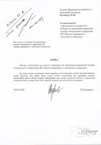 20.03.2009 года Андреев П. П. подал заявление (копия прилагается) с просьбой об участии в конкурсе на замещение вакантной должности генерального директора ГП «Центр ГЗК».