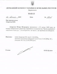 Приказом Госкомзема от 13.02.2009 года № 67-кт «О возложении выполнения обязанностей» с 13.02.2009 года возложено выполнение обязанностей генерального директора государственного предприятия «Центр ГЗК» на Андреева П.П., в 2004-2006 гг. возглавлявшего ГлавКРУ Украины, а с 30.01.2009 года работающего первым заместителем генерального директора ГП «Центр ГЗК».