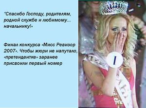 Не секрет, что организация и проведение таких мероприятий - дело недешевое. На реализацию прихотей «миссис КРУ» были брошены все возможные источники финансирования. Так, например, весь фонд профкома работников органов КРУ, при задекларированном на 2007 год мероприятии по празднованию Дня защиты детей, по указанию Петра Петровича был потрачен - до копейки! - на организацию ведомственного «смотра красоты». [2]