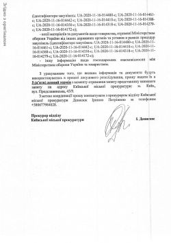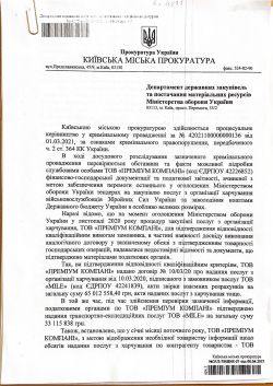 По данным прокуратуры, в рамках уголовного производства № 42021100000000136 от 1 марта 2021 года были установлены факты подделки служебными лицами ООО "Премиум компани" финансово-хозяйственной документации и налоговой отчетности с целью достижения победы в тендере Минобороны по закупке услуг по организации питания военнослужащих Вооруженных сил Украины.