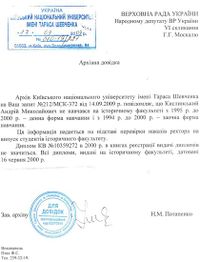 В связи с этим замглавы СБУ обратился в суд, а его ведомство - в Генеральную прокуратуру с просьбой проверить факты противоправных действий работников органов внутренних дел Украины, которые якобы проводили незаконный сбор информации о личной жизни заместителя главы СБУ. Однако Москаль вскоре нашел новое пятно в биографии Кислинского. В ответ на депутатское обращение политика от 27 августа 2009 г. Секретариат Президента предоставил копию диплома Кислинского из его личного дела о получении квалификации "историк" и "преподаватель исторических дисциплин" по специальности "История". Диплом датирован 30 июня 2000 года. Вместе с тем, Москаль обратился в архив Киевского национального университета им. Тараса Шевченко, где на основании проверки приказов ректора на выпуск студентов исторического факультета сообщили, что Кислинский с 1995 по 2000 год на дневном отделении и на заочном отделении с 1994 по 2000 год не учился, а номер и серия диплома, которые парламентарию сообщили в СП, в книгах регистрации выдачи дипломов не значится.