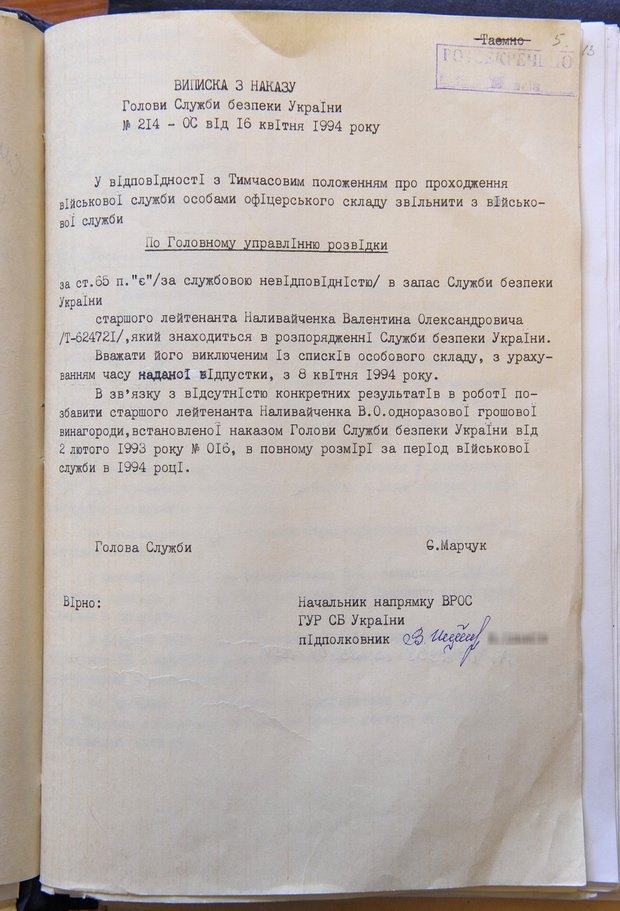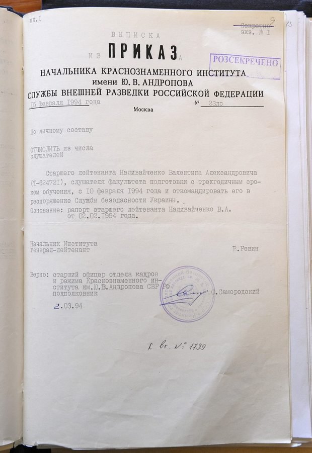 И, действительно, 24 октября в Facebook появились рассекреченные материалы личного дела старшего лейтенанта Валентина Наливайченко — сопроводительная записка из института Андропова, приказ об его откомандировании в Службу безопасности Украины, рапорт Валентина Наливайченко об увольнении со Службы безопасности Украины от 14 февраля 1994 года и, наконец, выписка из приказа об увольнении с военной службы по «служебному несоответствию» в запас СБУ.