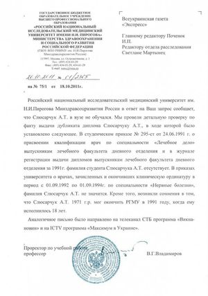 Но, как оказалось, Слюсарчук стал в Украине доктором медицинских наук и профессором на основании фальшивых российских дипломов.