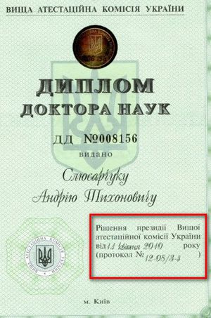 Дмитрий Табачник присвоил Слюсарчуку звание профессора, а впоследствии, уже после того, как разгорелся скандал, утверждал, что российский диплом «Доктора Пи» о получении ученой степени является самым настоящим. И о Викторе Януковиче, который награждал Слюсарчука [5]}}