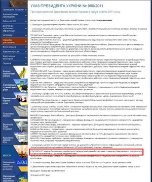 Указом Президента Украины Виктором Януковичем № 960/2011 от 30 сентября 2011 года профессору кафедры "Информационные системы и сети" Национального университета "Львовская политехника", доктору медицинских наук Слюсарчуку А.Т. за цикл работ "Комплекс образовательных информационных технологий предоставления, запоминания и обработка сверхбольших объектов информации в процессе обучения" присуждена Государственная премия Украины в области образования 2011 года. Размер премии составляет 150 000 гривен. Ученик проФФесора Пи Червоный Александр Петрович также получил премию[2].