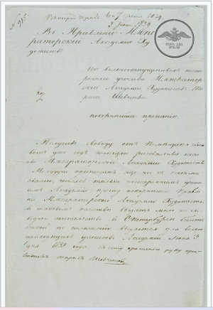 Заява Шевченка до правління Академії мистецтв про видачу квитка на право мешкання в Петербурзі (1839)