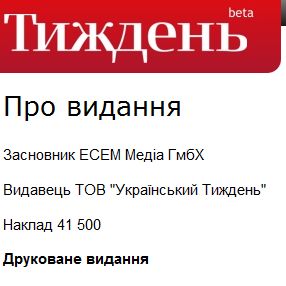 | Справка: Український Тиждень - украиноязычный еженедельный общественно-политический журнал. Принадлежит неизвестному инвестору, интересы которого представляет Роман Цуприк[1], брат совладельца Сорбес-Украина (Sorbes Group - деревообрабатывающая индустрия Ровенщины и Прикарпатья) Богдана Цуприка [2] (возможно, совместно с Владимиром Жириновским и братьями Суркис). |