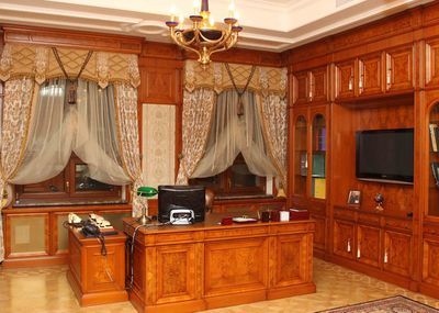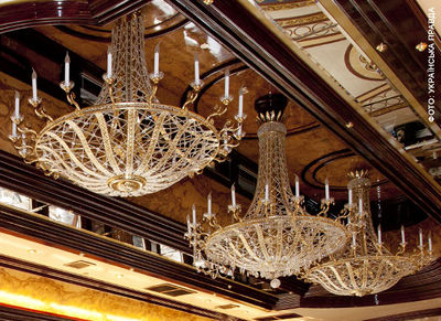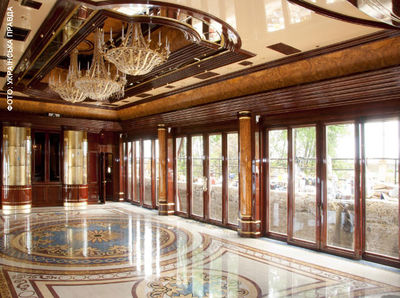 Предметы роскоши в отделочных материалах и предметах интерьера присутствуют везде, от ступенек из дорогого итальянского мрамора, до дорогих люстр.