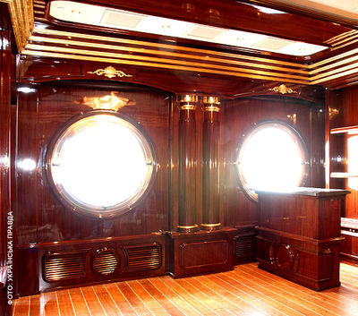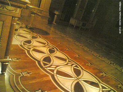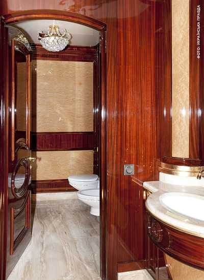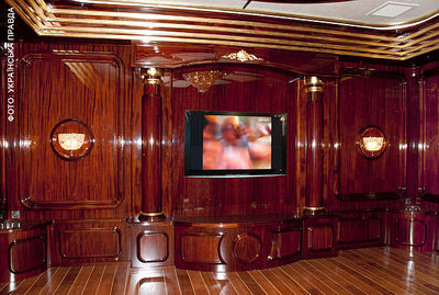 Этот дебаркадер состоит из нескольких помещений. Основное - это банкетный зал с эстрадой. На стенах и потолке - ценные породы древесины, на полу - мрамор, везде вокруг - позолота и хрусталь. Также на дебаркадере, как пишет издание, есть отдельный кабинет Януковича и санузел.