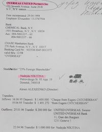 В 1994 году в Нью-Йорке была зарегистрирована компания Overseas United partners. Совладельцем этой компании в 1996 году была Надежда Никитина жена Евгения Щербаня (она владела долей в 25%), другими основателями была компания "Гефест" и Авиалинии "Донбасс".